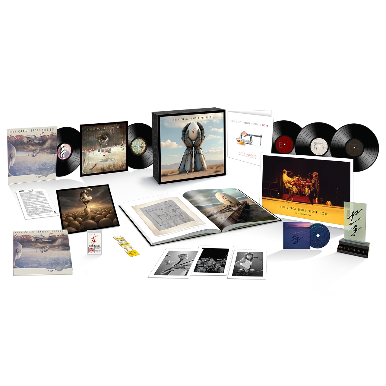 Grace Under Pressure amps up with a limited edition Super Deluxe boxset featuring 5 180-gram LPs, a Blu-ray and 52-page hard cover book. LP 1 features the original 1984 stereo mix newly remastered from the original analog stereo master tapes by Sean Magee at Abbey Road Studios. GUP was the first Rush studio album Terry Brown didn’t produce after working with the band for 10 years, now on LP 2 we get to hear Terry Brown’s brand-new stereo mix of the album created from the original studio album analog multi-tracks. The 1986 concert home video Grace Under Pressure Tour only featured a portion of the show performed on September 21, 1984 in Toronto, now for the first-time ever the complete concert is presented newly mixed from the original multi-track audio masters and with a newly edited concert video from the camera masters featuring over 37 minutes of additional performances. Newly titled Grace Under Pressure Tour: Live in Toronto 1984, the complete live album is experienced on 3 LPs with the concert video newly remastered in HD and offered in Dolby Atmos, 5.1 surround and stereo newly mixed by Terry Brown on the Blu-ray. Furthermore on the Blu-ray disc, the GUP studio album is newly mixed by Richard Chycki in Dolby Atmos & 5.1 surround from the original album multi-tracks, Terry Brown’s new album mix is presented in high-resolution stereo, along with the band’s 4 music videos are visually remastered in HD and featured in 5.1 surround and stereo. Geddy Lee pens the liner notes reflecting on the memories of finding a new producer and reminiscing on a recent re-listen of GUP while Hugh Syme re-imagines the original album cover along with creating brand-new illustrations for each song and more in the book. Collector’s are graced with a custom acrylic GUP LED Light-up Display, replicas of the GUP Tour Book, Toronto Concert Ticket, GUP Tour Total Access Backstage Pass, Pressure Release – 6-page Press Release; plus 3 Band Live Photo Lithos an...