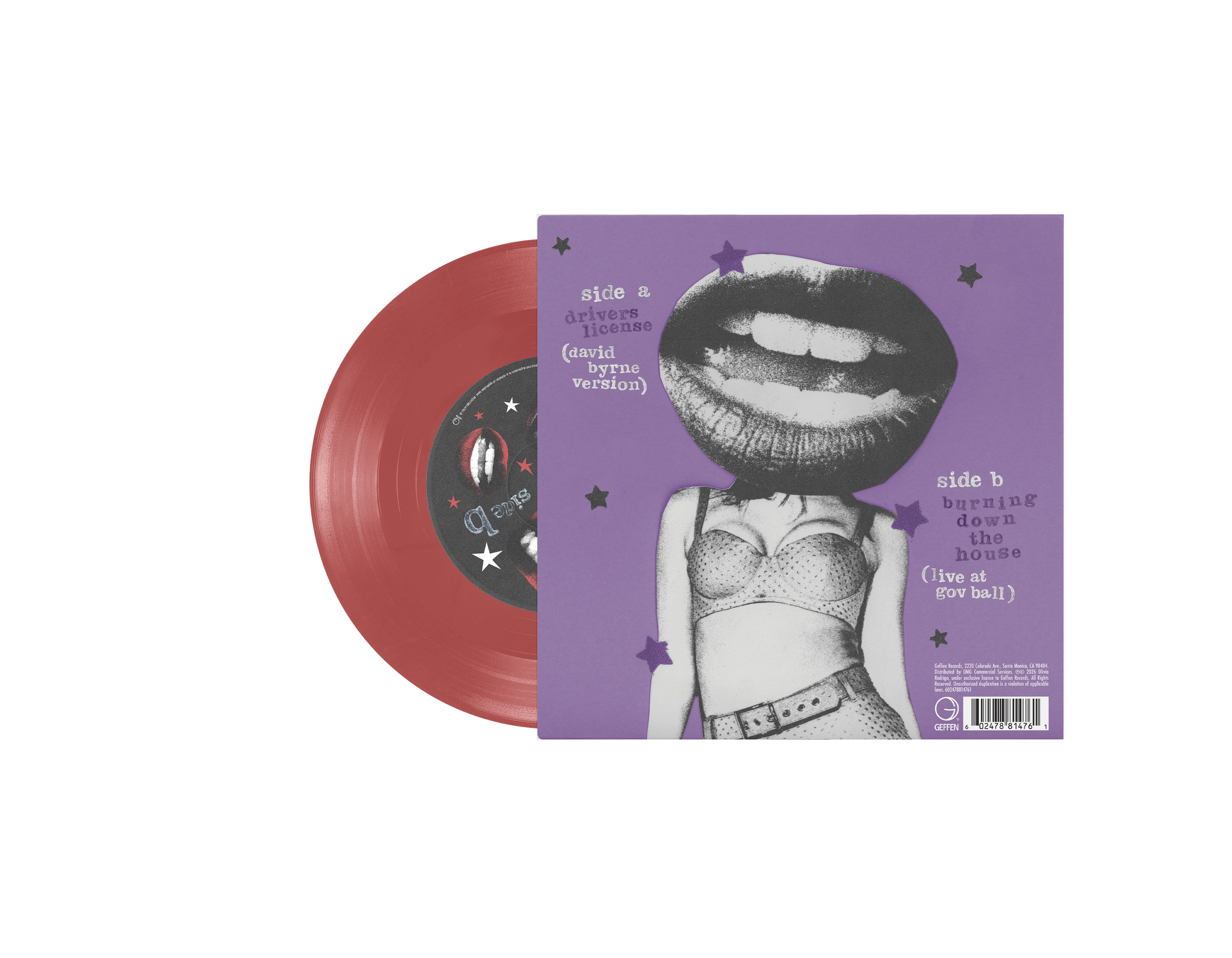 Experience “drivers license” for the first time all over again—this time through the voice of the legendary David Byrne. Celebrating five years since Olivia’s breakout single, this limited first pressing vinyl features Byrne’s cover of “drivers license” on Side A, and Olivia and David’s live performance of “burning down the house” from Governor’s Ball on Side B. Pressed on red translucent 7-inch vinyl.
